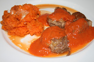 NOTE: You can also transfer the veggies to a food processor and process them or transfer the broth to a bowl and use a stick blender to puree the veggies in the skillet. - To serve, plate 2-3 medallions and drizzle with sauce. Slit potatoes and mash the insides with a fork; scoop onto plates or serve in the skin. Season with salt and pepper and top with butter, if desired.